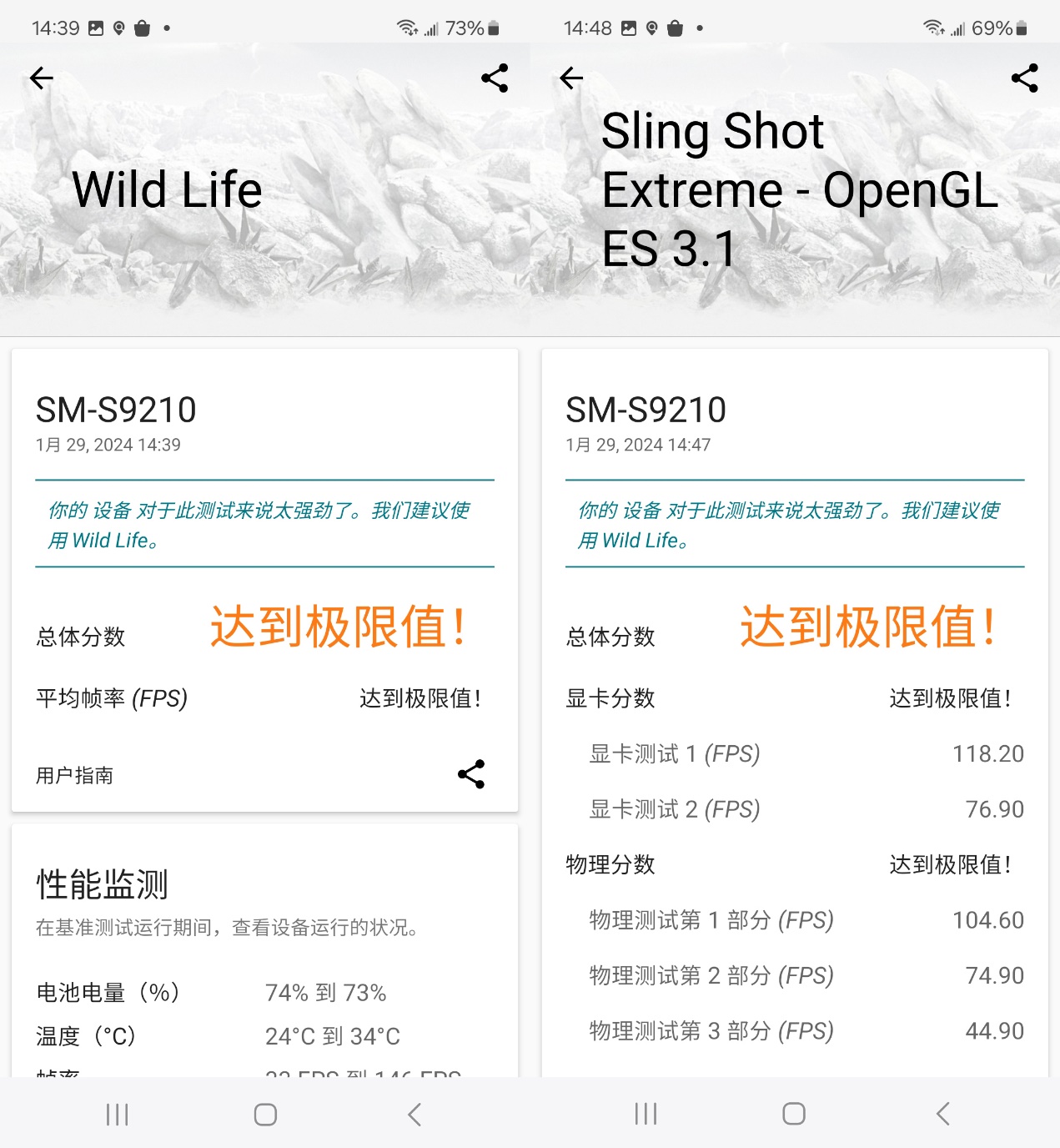 在3D Mark测试环境下,三星Galaxy S24在Wild Life测试中总体分数、评分帧率达到极限值,在Sling Shot Extreme-OPENGL ES 3.1测试中总体分数达到极限值,显卡分数和物理分数都达到极限值。