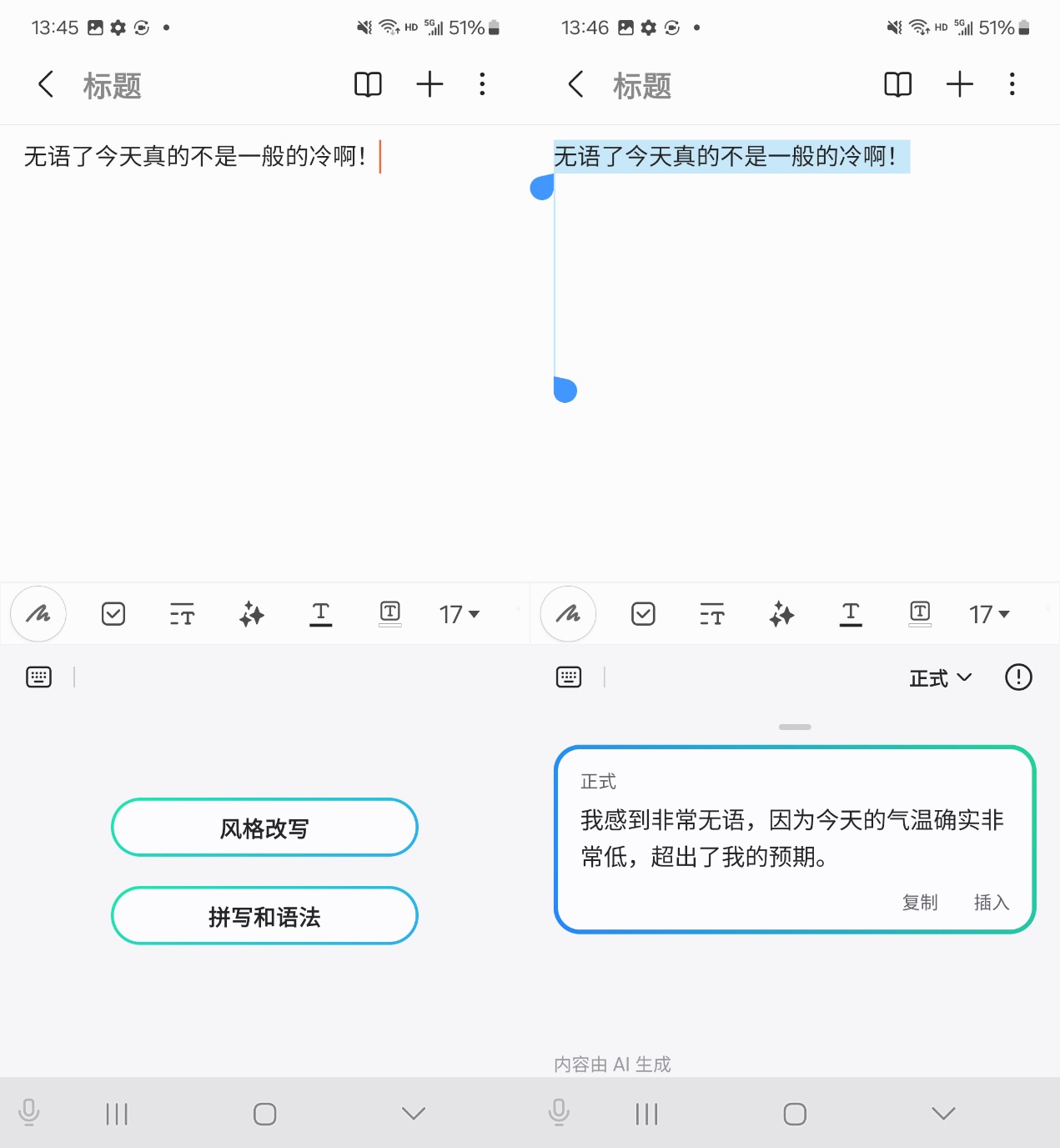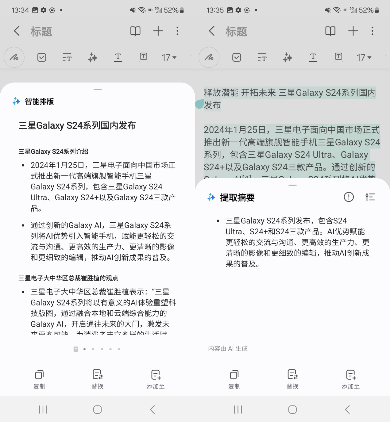 此外三星Galaxy S24还支持区分发言者的录音转录功能和一键提取摘要、智能排版等功能。在短信和其他app中,写作助手还可以帮助用户在沟通时根据不同的对话场景,选择更适合自己的语言风格,非常有意思。