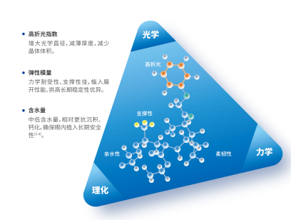 国产“ICL” - 龙晶 PR 型晶体作为第一款国产自主研发上市的眼内镜产品,凭借其卓越的科技优势,不仅为患者提供了更多选择,也为屈光手术领域的发展注入了新动力。龙晶 PR 型晶体的核心技术优势为“折射率高、大光学区、度数型号精准、拱高远期稳定性好”。这些优势的实现,源于其独特的材料和设计。
