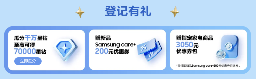 前往三星官网,即可进入新品登记页面。按页面要求完成登记后,即可获得一次瓜分星钻的机会。如果参与活动的朋友还想获得更多瓜分机会,只需继续完成页面中的其他任务即可,最高可获得70000星钻(价值700元)。除此之外,登记后赠送的200元新品Samsung care+优惠券,则可在新品发售后与新品搭配购买使用,或者在收到新机并激活后,15天内通过官网Samsung care+页面单独购买。