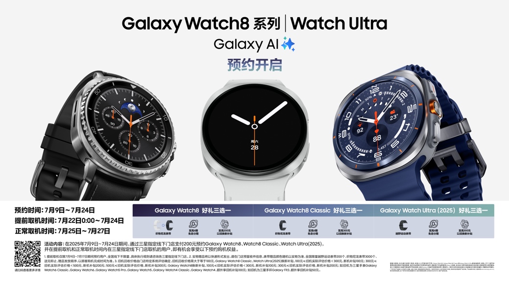 三星Galaxy Watch8、Galaxy Watch8 Classic以及Galaxy Watch Ultra(2025)将于7月9日23:00,在三星商城、三星京东自营官方旗舰店、天猫三星官方旗舰店、抖音三星官网旗舰店等线上渠道以及线下授权三星门店正式开启预约,并于7月25日正式开售。