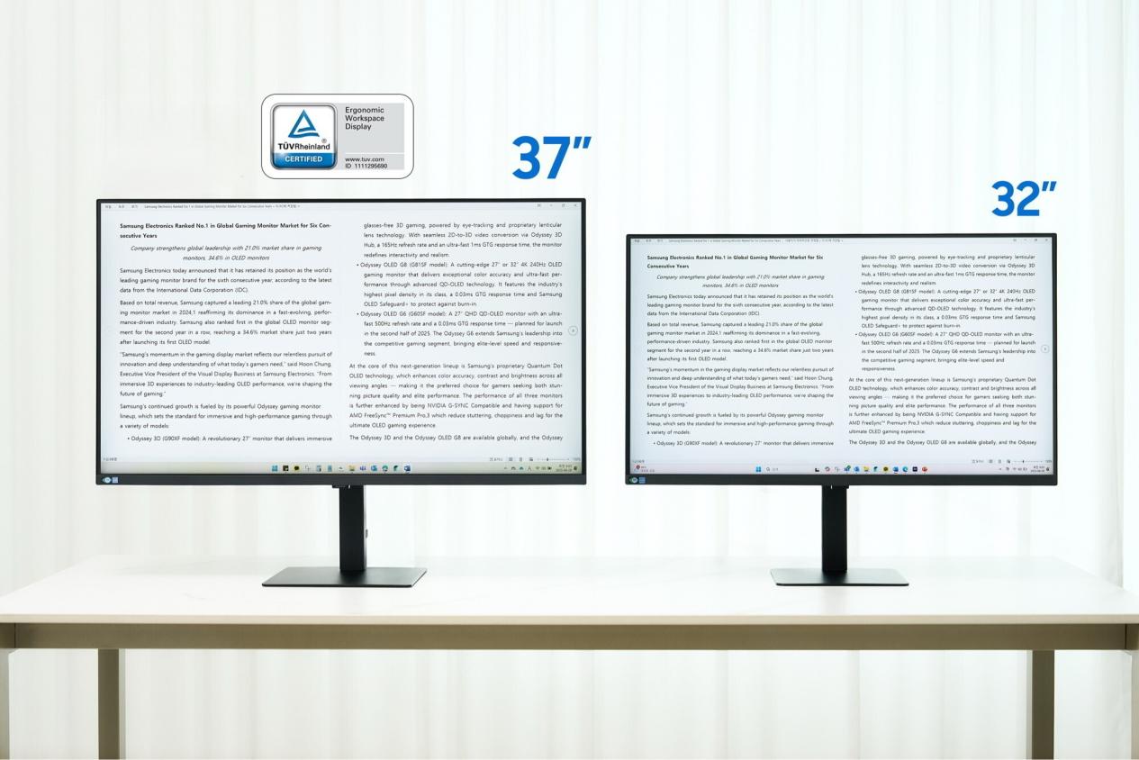 ▲ (左起)37英寸与32英寸三星ViewFinity 绘域S80UD系列显示器对比:相同显示设置下,37英寸机型呈现更优异的文本可读性。37英寸S80UD系列机型已获得德国莱茵TÜV“人体工学工作空间屏幕”认证。