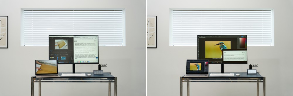 在灵妙双屏模式下,用户可将一台笔记本电脑和一部Type-C接口的三星智能手机同时连接至显示器,将屏幕左右两侧作为独立显示区域使用。另外,用户也可以在笔记本端播放参考视频,同时在显示器上进行编辑操作,并通过画中画功能浏览相关文献。通过内置KVM切换器可轻松切换鼠标所在信号源,实现所有操作一站式管理。